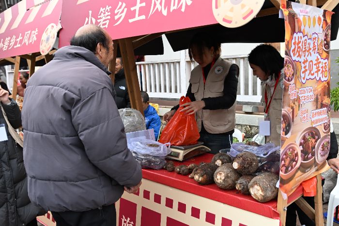 图为实践队在福田村集市开展樟洋槟榔芋推广销售。杨雨松 供图