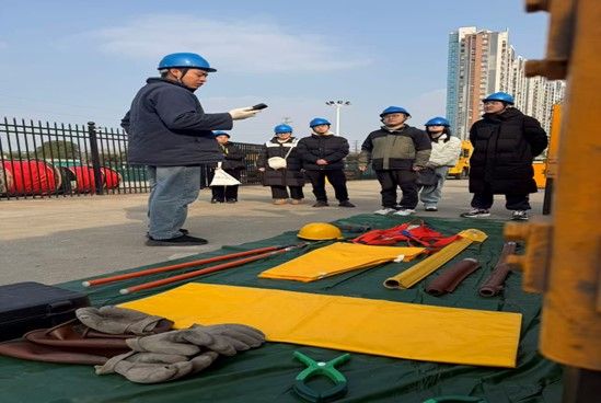 在铺着绿色帆布的安全工器具陈列区,黄色绝缘毯、红色安全带、验电笔等装备整齐摆放。“验电必须执行‘先验证、再使用’原则,绝缘工器具要定期检测并标注合格标识。”学员们轮流上手操作,学习识别不同电压等级对应的防护装备,在实操中筑牢安全底线。