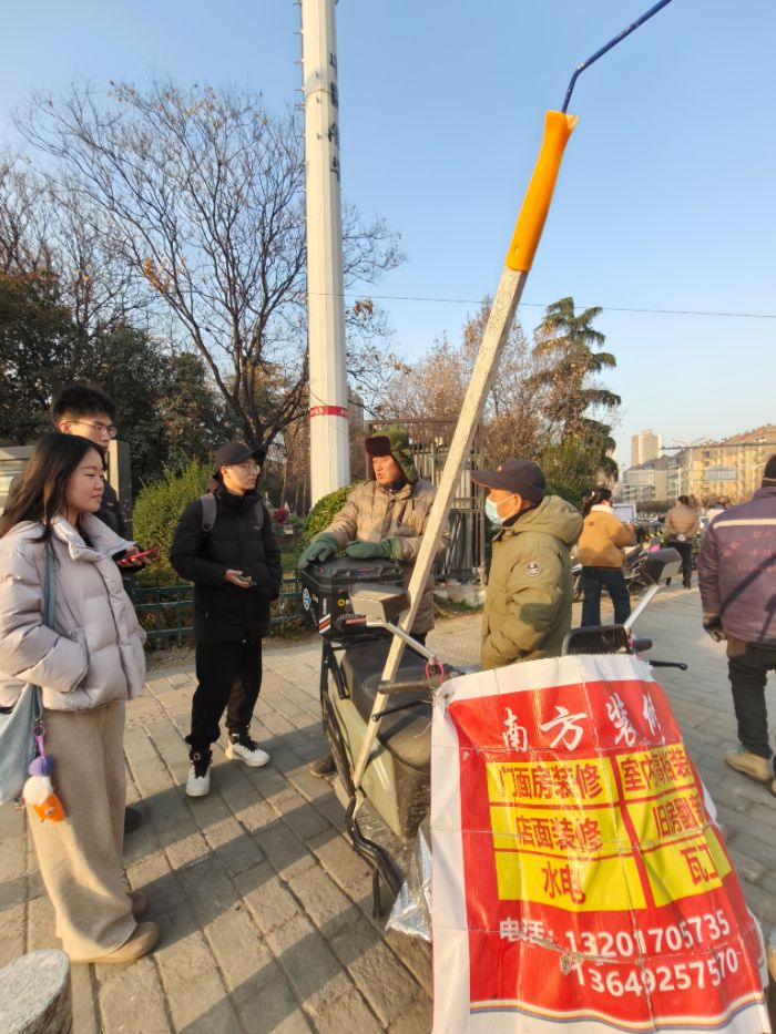 随后,实践队辗转至长安区韦曲北街、雁塔区朱雀大街南段等农民工日常聚集揽工点。此处,众多木工、瓦工、抹灰工或在等候工作,或于劳作间隙休憩。队员们主动上前,围绕技能提升、就业渠道、数字工具使用情况及服务需求等话题展开交流。交流中发现,务工者对智慧城市建设与人工智能工具的了解与使用程度不尽相同,部分人对其实际应用效果持观望态度,更倾向于依赖熟悉的线下操作与经验。队员们不仅收集了大量一手情况,也现场对一些常见的手机操作问题进行了耐心解答,在互动中增进了理解与信任。