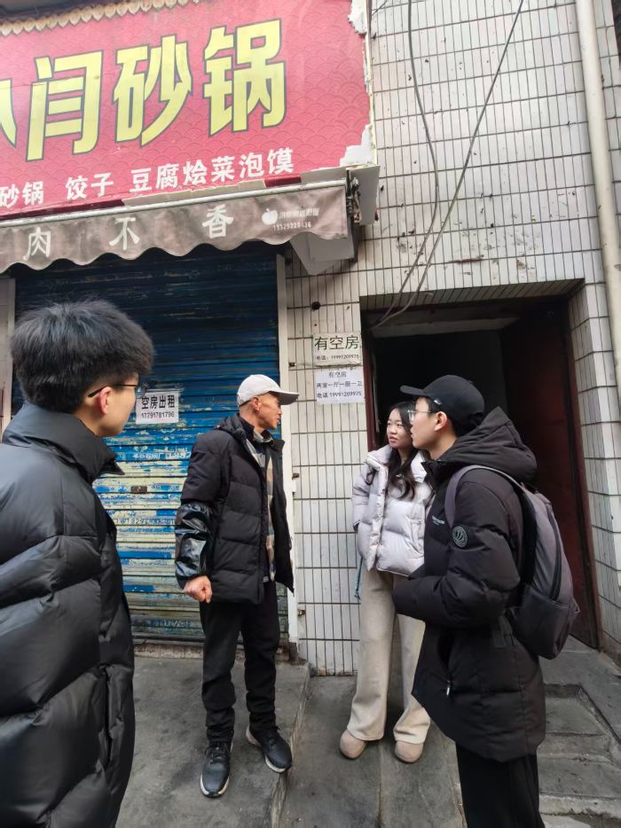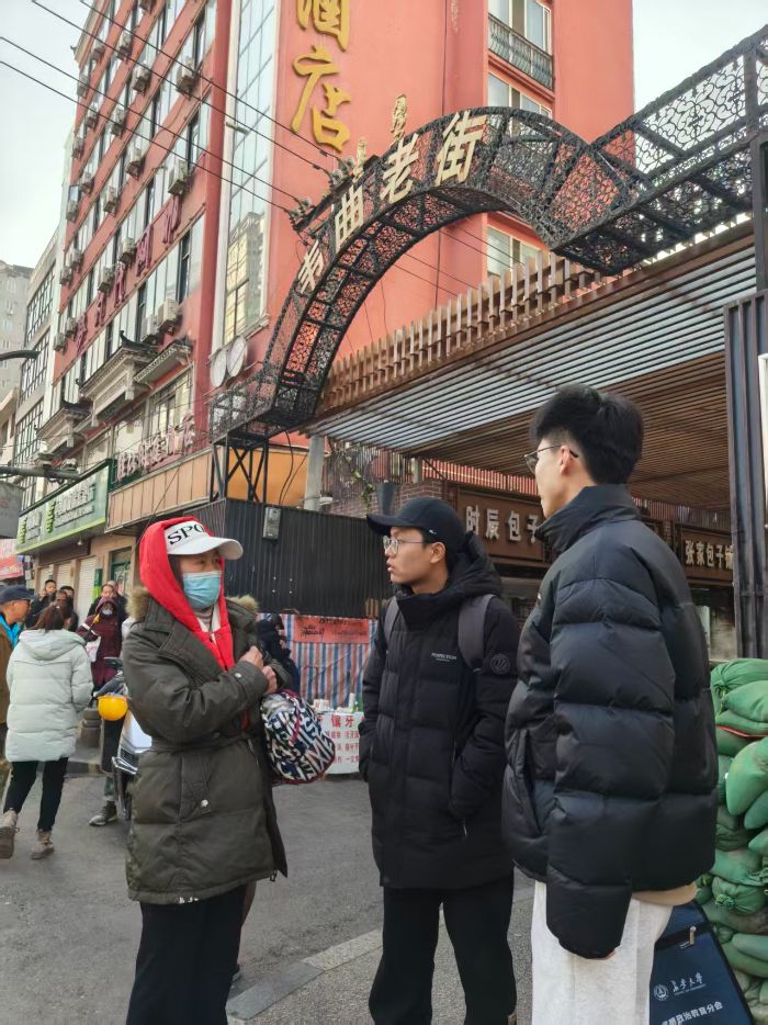 1月28日清晨,实践队首站来到雁塔区长延堡街道西八里村。这里街巷交织,生活气息浓郁,是许多农民工在城市中的落脚点。队员们深入餐饮摊位、社区小店、街角空地,与在此居住的农民工进行面对面交流。访谈内容涵盖居住条件、生计收入、子女教育、公共服务获取等方面,并重点聚焦于他们对人工智能技术的认知程度、数字工具的使用能力及实际应用体验。“手机上的缴费APP步骤有时候看不懂,子女不在身边就只能跑线下”“网上的招聘信息五花八门,怕被骗不敢轻易尝试”,农民工们的朴实话语,道出了数字化生活中的真实困惑。队员们悉心聆听、详细记录,深切感受到这一群体在智慧社会进程中所面临的数字壁垒。