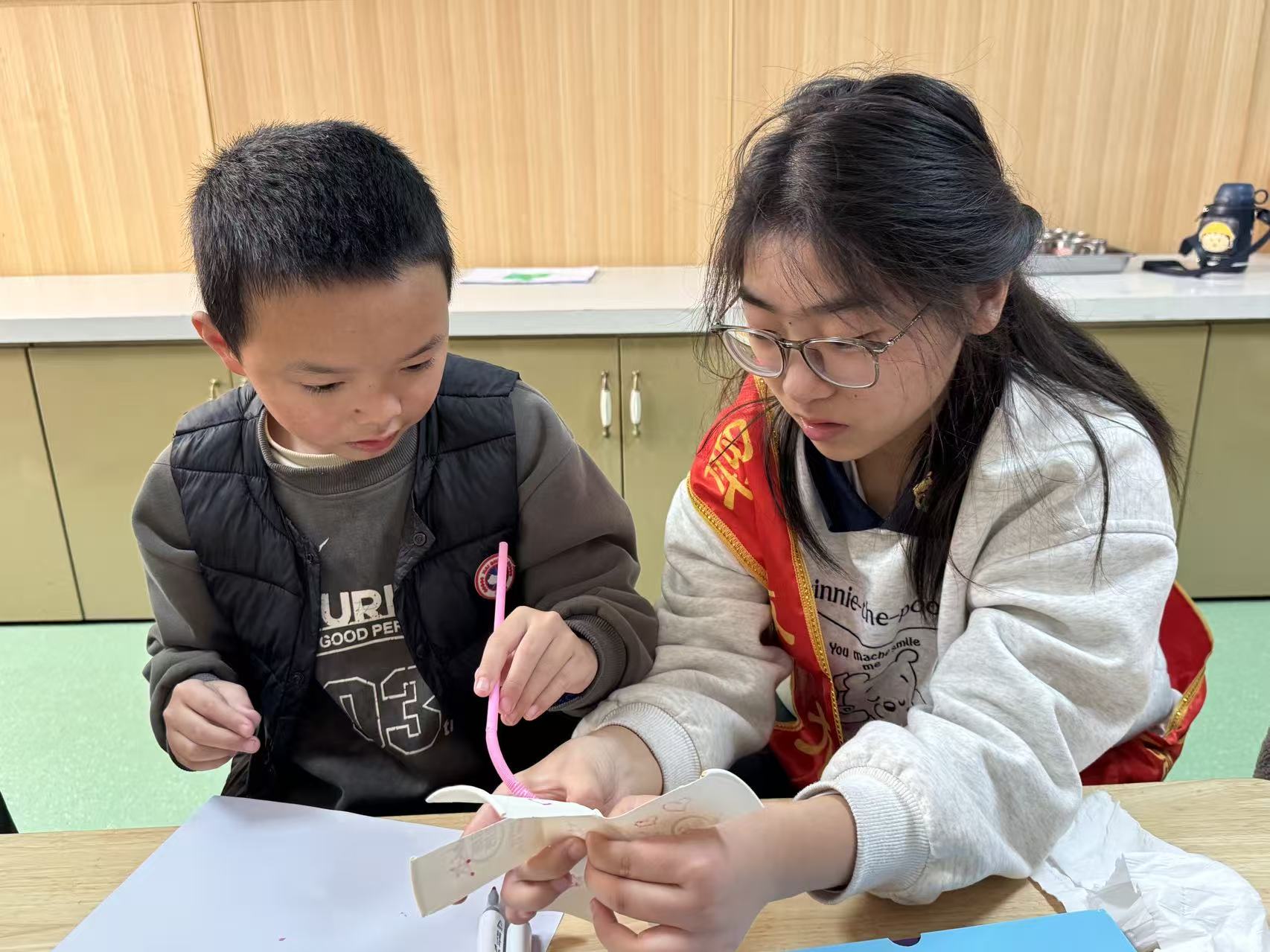 图片中志愿者正手把手教孩子在风车叶片上插吸管