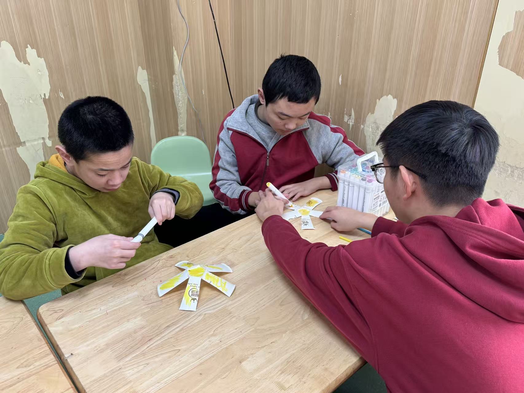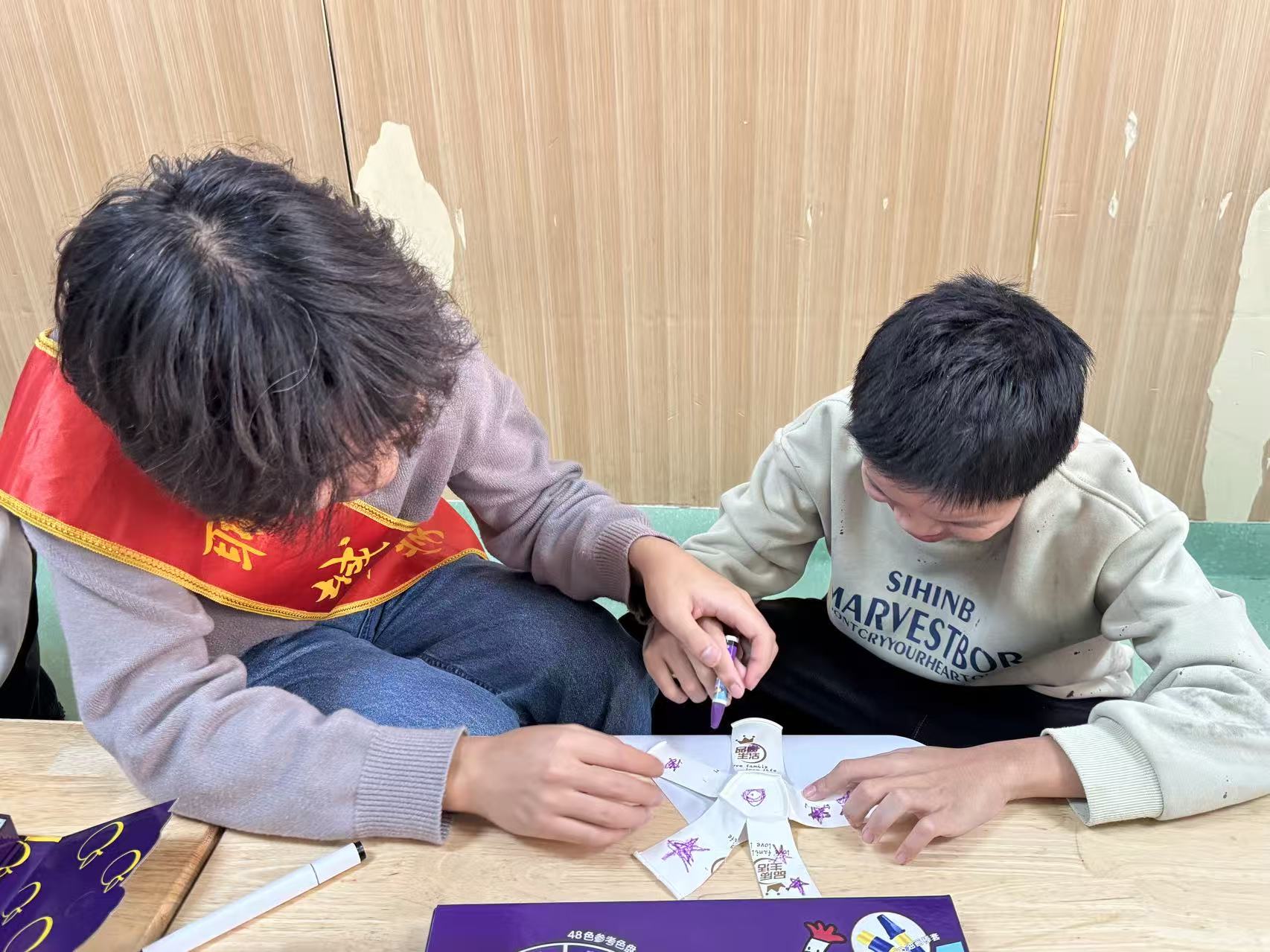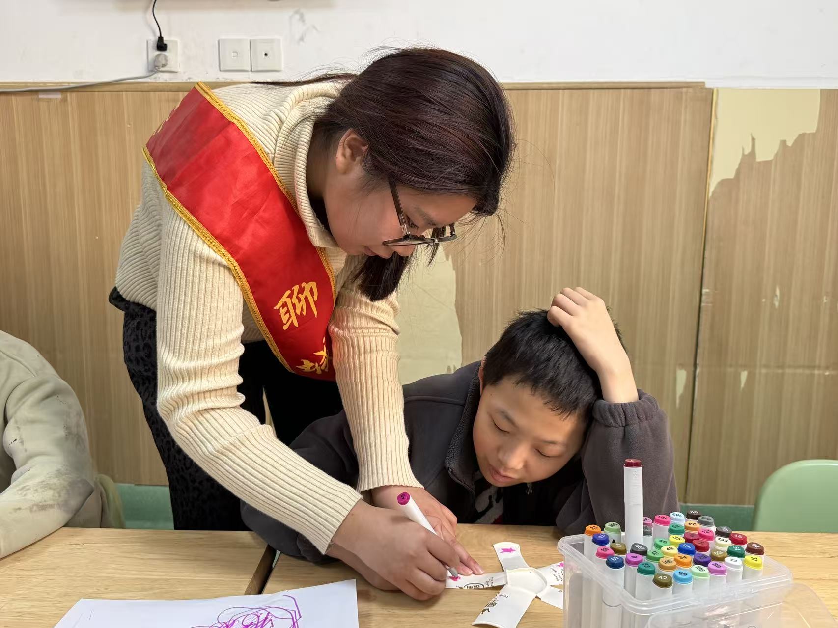图片中志愿者坐在孩子前,专注地用彩笔为纸杯风车叶片上色