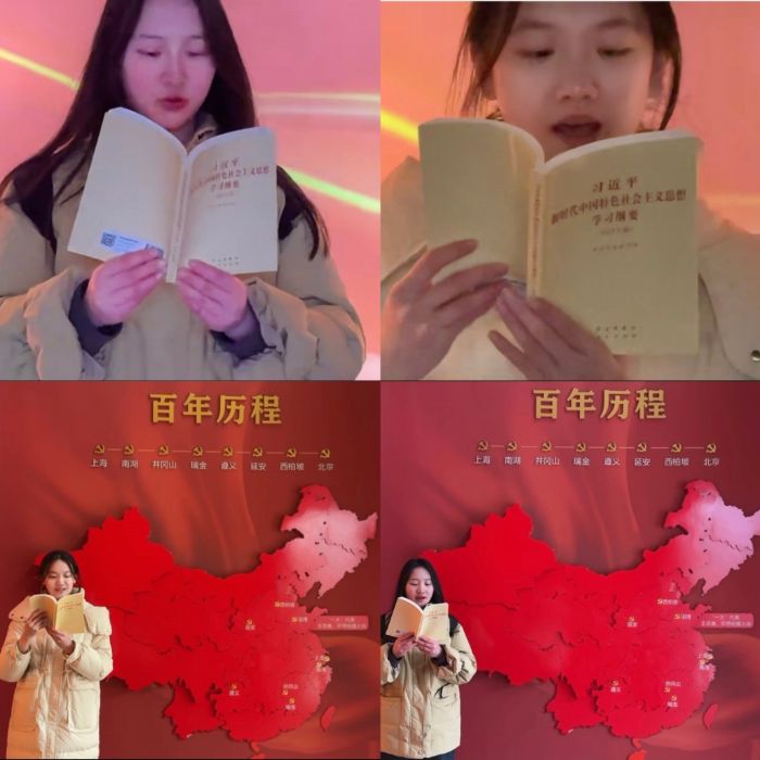 调研尾声,一场特殊的思政课在实践地开展。在有着红色记忆背景的展厅内,一面巨大的中国地图映红了学子们的脸庞。团队成员手捧《习近平新时代中国特色社会主义思想学习纲要》,神情庄重,声音铿锵。“必须坚持在发展中保障和改善民生,鼓励共同奋斗创造美好生活,不断实现人民对美好生活的向往。”诵读声回荡在场馆之中,这不仅是对理论知识的重温,更是对本次社会实践主题的升华。从关注一张小小的文旅消费券,到思考整个县域经济的转型;从询问一位商户的收入,到感悟“民生福祉”的宏大命题。队员们深刻体会到,“砥砺深耕为人民”绝不是一句空洞的口号,它体现在每一次为地方发展出谋划策的思考中,体现在每一次走进基层、了解民情的脚步里。