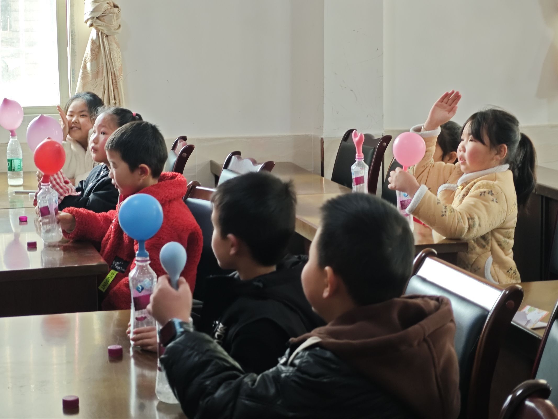 ▲图为孩子们操作“气球变大”实验,热情地举手分享收获