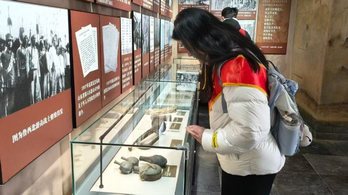 沿着展厅缓步前行,展柜内泛黄的书信、锈迹斑驳的步枪、磨损严重的军帽以及标注详尽的战斗地图,将队员们的思绪缓缓拉回那个战火纷飞的抗日年代。每一件文物都承载着厚重的历史,镌刻着不屈的民族精神,每一段文字介绍都诉说着将军保家卫国的峥嵘岁月。队员们放慢脚步,驻足凝视,不时弯腰细看文物说明,低声交流感悟。在一件锈迹斑斑的指挥刀前,队员们停留许久,这把刀的刀鞘早已失去光泽,刀刃上还残留着岁月的痕迹,据纪念馆工作人员介绍,这把指挥刀是范筑先将军当年指挥战斗时使用过的,见证了他带领鲁西军民奋勇抗敌、浴血奋战的壮烈场面。