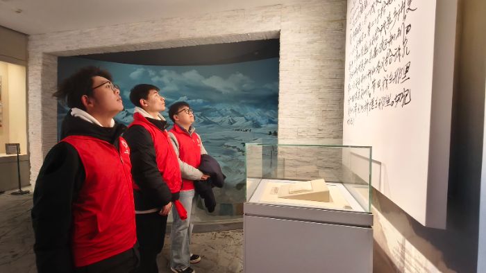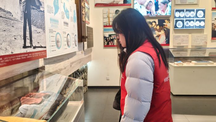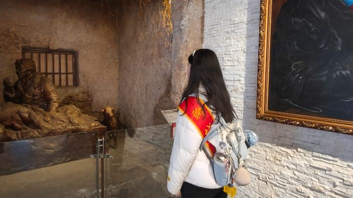 志愿者驻足在孔繁森同志生活场景复原雕塑前,静静凝望复原场景与展品,沉浸式感受先辈在艰苦环境中坚守使命、为民奉献的动人岁月。