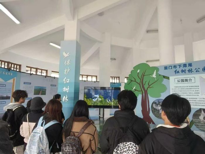 通过与园区工作人员、往来游客的深入交流,队员们厘清了这片“海上森林”的蝶变历程。昔日下潭尾因无序养殖、围海造地陷入严重污染困境,原生红树林踪迹绝迹。2005年起,在国家战略指引、地方政府全力推动及“红树林之父”林鹏院士团队深耕细作下,历经退养清滩、围堰造滩、科学育种等一系列攻坚举措,这里从污染滩涂华丽蜕变为全省最大的人工重构红树林公园。