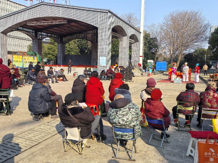 图为文化广场上老人观看民间黄梅戏演出的画面。王祺供图