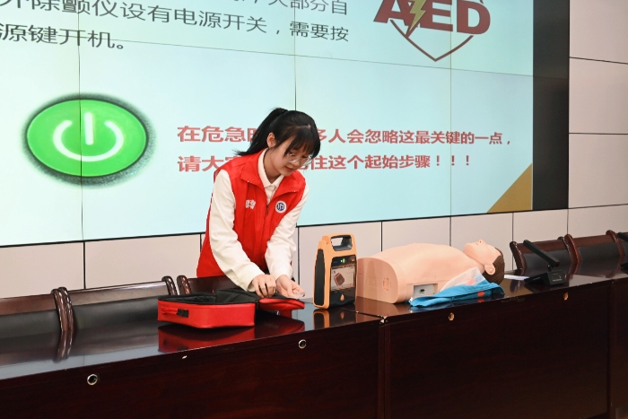 健康科普的脚步随后走进长汀县水利局。实践队员围绕心肺复苏与AED操作流程展开系统讲解与示范,干部职工们专注聆听、主动上手体验。“以前觉得急救很遥远,今天亲手试过才明白,救命技能其实离我们每个人都很近。”一位职工的话,道出了增强群众急救意识、守护生命安全这一新时代“长征”的重要意义。