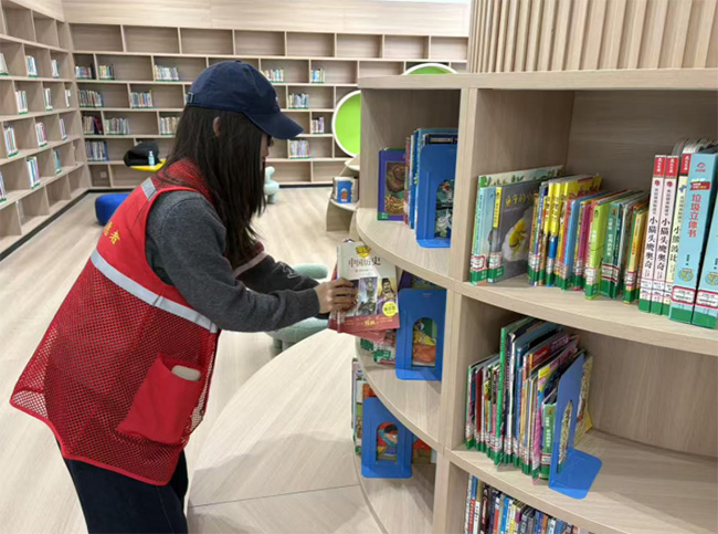 新馆开放后,张佳星同学在森林童话书屋继续进行图书管理工作:按照图书分类与摆放规范,对森林童话书屋内陈列书籍进行整理、归位与规整摆放,维护书屋阅览环境的整洁有序;面向读者提供AI自助借阅机操作指导服务,及时解答读者在自助借阅、图书归还过程中遇到的设备操作问题,协助读者顺利完成借阅流程;负责对读者归还的图书进行清点、整理与分类,严格按照图书排架规则完成归还图书的重新上架工作;主动为读者提供图书检索与查找服务,根据读者阅读需求精准定位书籍位置,协助读者快速找到目标图书,保障读者借阅体验顺畅高效。
