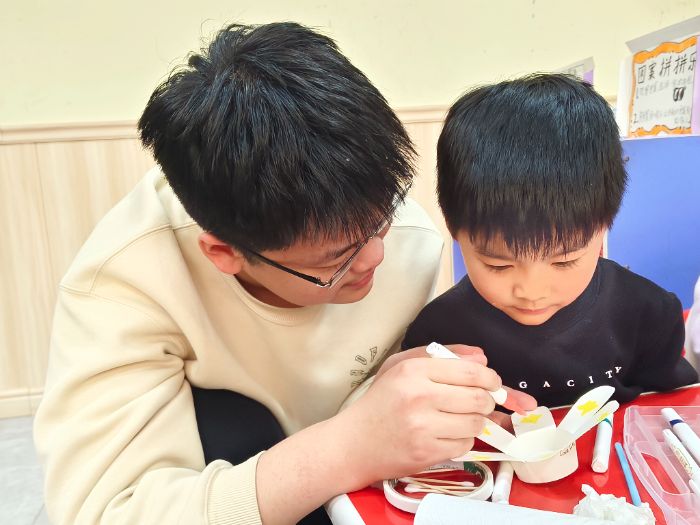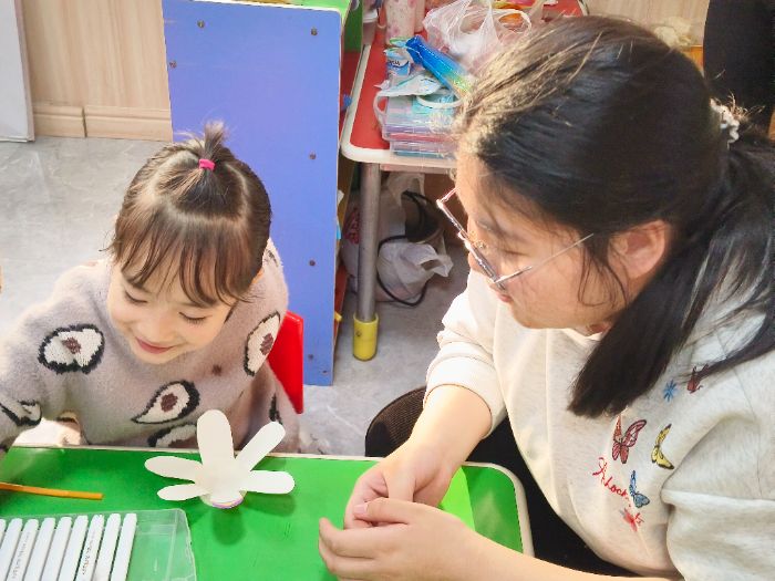 (图为我志愿者指导小朋友进行风车的制作,袁睿晗通讯员摄)