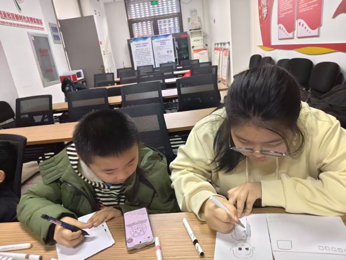 活动现场,志愿者化身讲师,用通俗易懂的语言梳理新文化运动至建党初期的历史脉络,生动讲述了陈独秀、李大钊等革命先驱为探寻救国之路而不畏艰难的故事。志愿者通过结合故事抛出问题,引导小朋友们感受先辈们坚守理想、奋勇抗争的品质。小朋友们踊跃举手,现场气氛热烈。在明信片创作环节,志愿者聚焦《觉醒年代》中的鲁迅、毛泽东等标杆人物,详解其生平事迹与精神内核,并指导青少年用彩笔描摹人物形象、摘抄名言警句或写下感悟。小朋友们大胆创新,将对先辈的敬仰与红色精神的传承融入一张张明信片中。