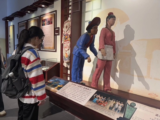 触摸实物温度,感知彩调发展变迁循着彩调的发展足迹,实践团来到永福博物馆,在彩调专属展区开启沉浸式探秘。泛黄的老艺人演出剧照、绣工精巧的戏服头冠、古朴的二胡与铜鼓伴奏道具、各时期的剧本刻本及现代彩调队的获奖证书,一件件珍贵展品串联起彩调从田间地头的民间小调发展为成熟戏曲剧种的演变之路。队员们驻足观察、细致记录,还与博物馆工作人员深入探讨彩调文化的当下保护现状与传承困境,更加明晰了非遗活化利用对地方特色文化传承发展的重要意义。