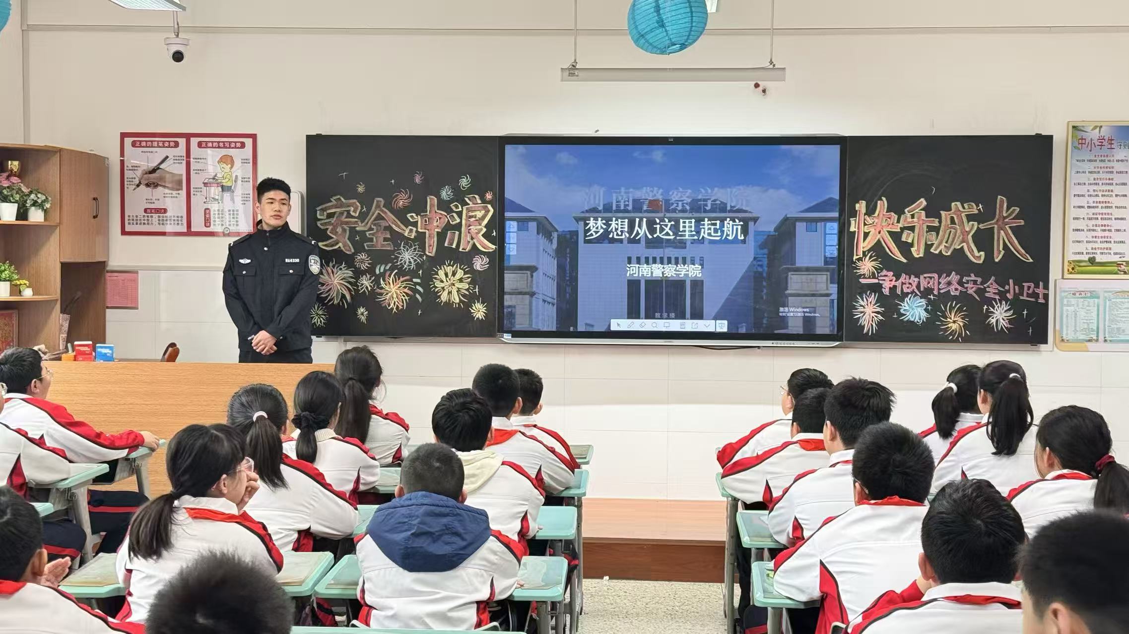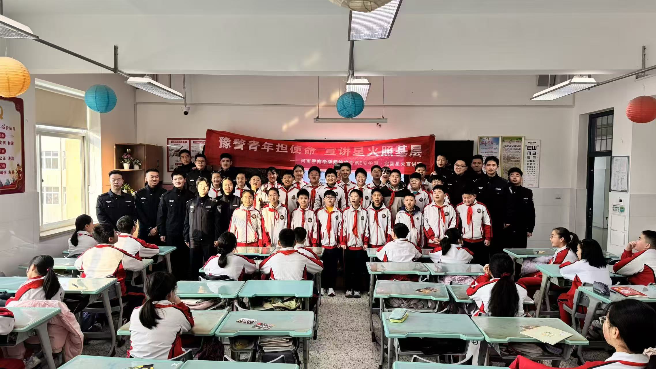 宣讲团成员们通过生动的课件讲述与视频展示向学生们分享了河南警察学院的警务化教育、专业训练等,展现了新时代学警刻苦学习、锤炼本领、矢志奉献的青春风貌。在与学生们的问答互动环节中,学生们对警察职业充满了好奇与敬意,团队成员们耐心解答,在他们心中播下了法治信仰与坚定理想信念的种子。