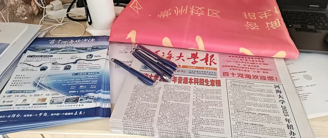2、 团队准备了招生宣传PPT、校园宣传视频、宣传册、横幅以及河海大学文创纪念品等物料。