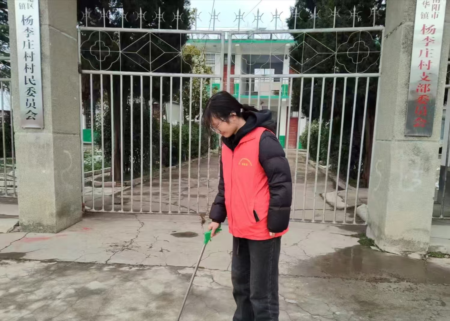 活动一开始,实践团成员就迅速投入到了环境清洁工作中。在杨李庄村村委会门前的广场上,志愿者们手持垃圾夹,仔细清理地面上的纸屑、包装袋等杂物;在乡村道路旁,志愿者们重点清理了垃圾桶周边散落的垃圾,把废弃物逐一捡拾起来并规范投放,用实际行动改善了村容村貌。