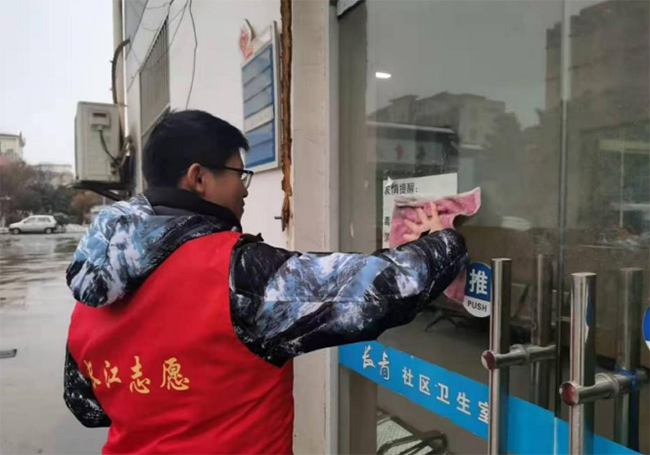 图为实践团成员于南通市如皋市知青社区清扫社区广场及玻璃 王秋喆 供图