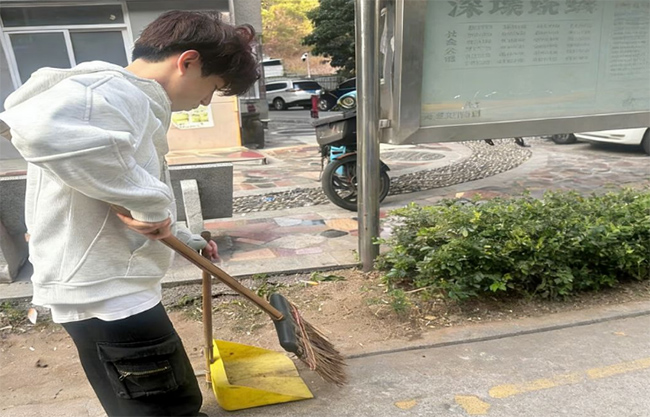 图为实践团成员于深圳市竹林社区清扫街道路面尘土和垃圾 颜伟光 供图