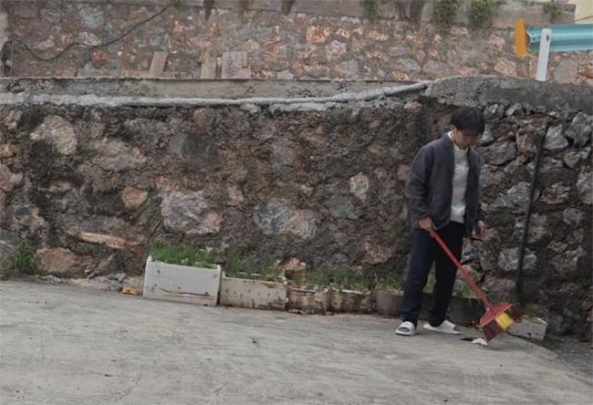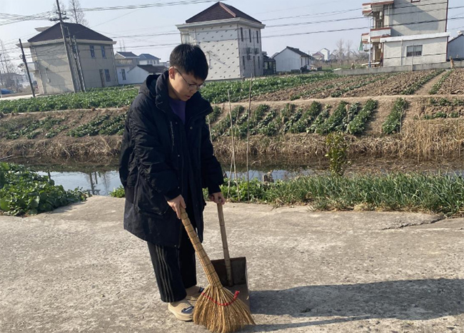 图为实践团成员于南通市海门区土地堂村清扫村道路面垃圾落叶 顾王景 供图
