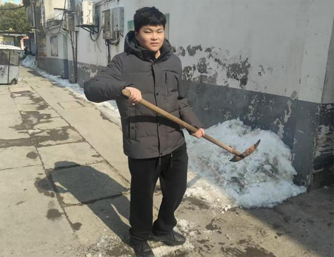 图为实践团成员于江苏宿迁泗洪县阳光社区铲除路面积雪、清扫碎冰 王嘉鸣 供图