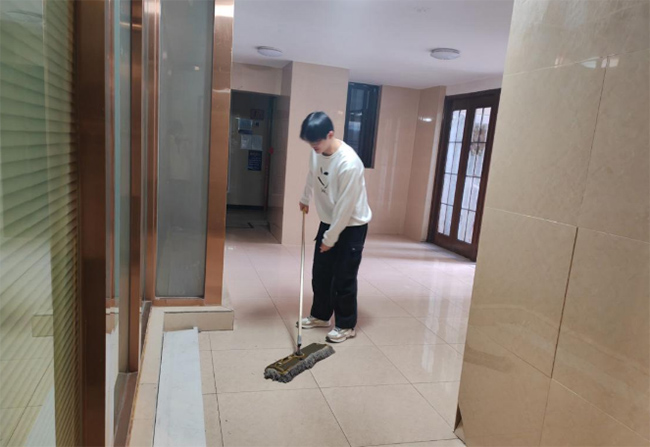 图为实践团成员于常州市裂帝社区清扫楼道地面 陈烨 供图