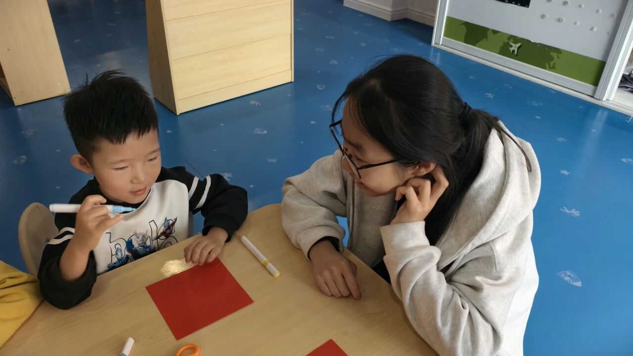 图为志愿者帮助小朋友制作剪纸。