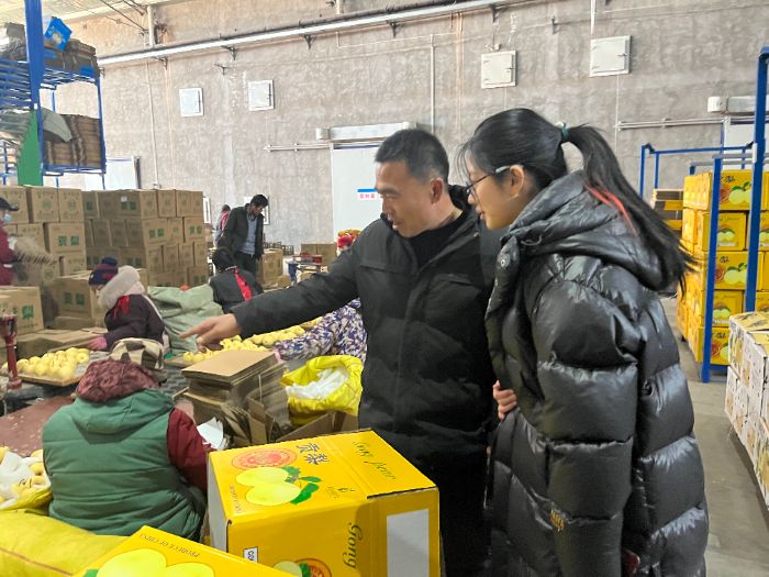 短暂休息后,四季鲜果库的杨照红经理接待并带领队员们实地考察了果库内部,深入了解酥梨从鲜果储存、分类包装到物流发货的全流程,团队成员们随后通过提问交流,详细了解酥梨的保存时长、存储要点、销售路径与实际售卖情况,把握酥梨产业的市场发展趋势。杨照红经理表示:“我们的酥梨不仅销往国内,更发往海外多个国家,酥梨的销售已经走向世界。”