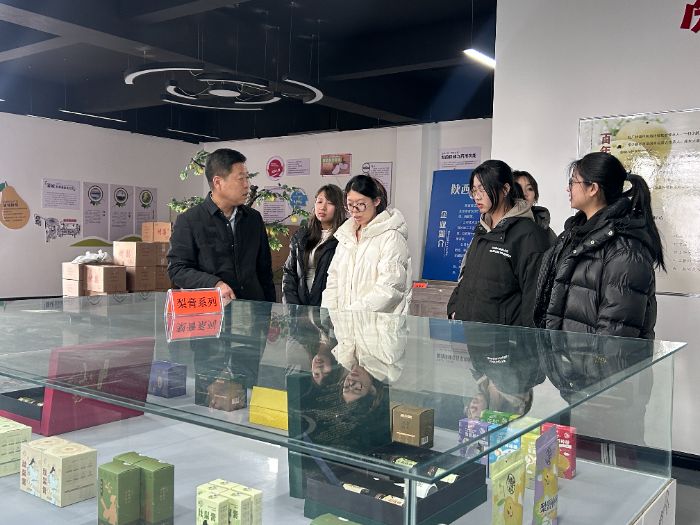 1月17日,团队前往陕西匠秦古匠心食品有限公司开展实地调研与深度交流。公司新媒体部门负责人张绵首先为团队介绍了企业在新媒体运营、产品销售及产品设计等方面的布局与成果。随后,公司董事长杨建平亲自带领团队参观产品展示区,并结合产品实物,详细讲解了企业围绕陕西本土特色农产品开展产品开发、品牌塑造与市场推广的实践经验。在随后的座谈交流中,团队围绕“皮影文化如何赋能酥梨等农产品包装与营销”这一核心议题,与企业方展开深入探讨。团队成员结合前期对皮影艺术特征的研究积累,提出了若干初步融合思路。企业方从市场角度对方案的可行性给予了积极反馈,双方就后续在文创设计、品牌推广联动方面达成初步合作共识,为“非遗+农产品”模式的落地打通了关键的企业合作通道。