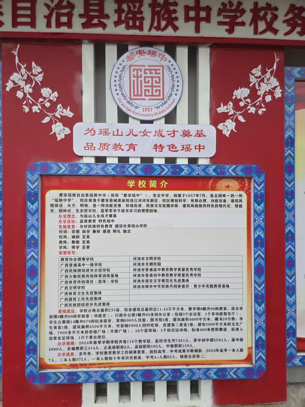 调研期间,团队成员深入校园一线,对都安瑶中的民族文化教育实践进行了全方位的了解。漫步校园,调研团成员被浓厚的民族特色文化氛围所吸引。学校紧紧围绕“打造特色瑶中”的办学目标,不仅在校园建筑外观、道路标识牌等硬件设施中巧妙融入了瑶族纹样、铜鼓造型等民族文化元素,更在教育教学的软环境中下足功夫,让中华民族共同体意识的种子在潜移默化中播撒进每一位学子的心田。