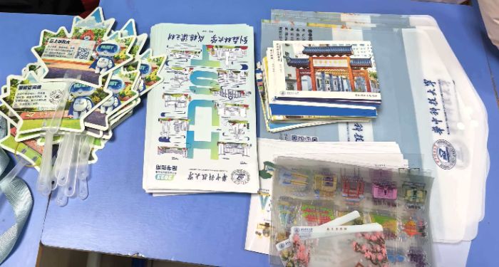 活动中,实践队员们通过宣传手册、明信片、文件袋等小礼物对华中科技大学的校园风貌及历年报考数据进行了更加详细的介绍。