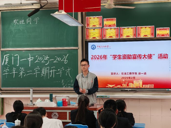2月25日,中国石油大学(华东)石油工程学院2024级本科生徐一涵以学生资助宣传大使身份,重返母校福建省厦门第一中学开展学生资助政策专题宣讲,为学弟学妹解读助学政策,扫清求学经济顾虑,助力青春逐梦。