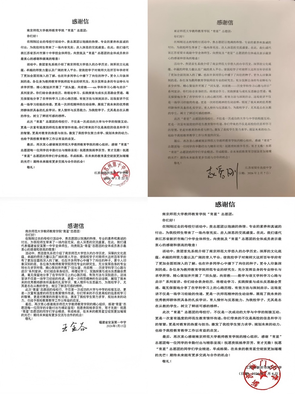 活动落幕,回响不绝。宣讲中学纷纷发来感谢信,称赞志愿团以准教师之姿践行育人初心,让高校宣讲既有高度又有温度。这个冬天,育星志愿团传承师生情谊,反哺成长之路。以感恩之心承接教诲、传递温暖,在代际滋养中延续初心、传递薪火,让青年的责任与担当在传承中生生不息。