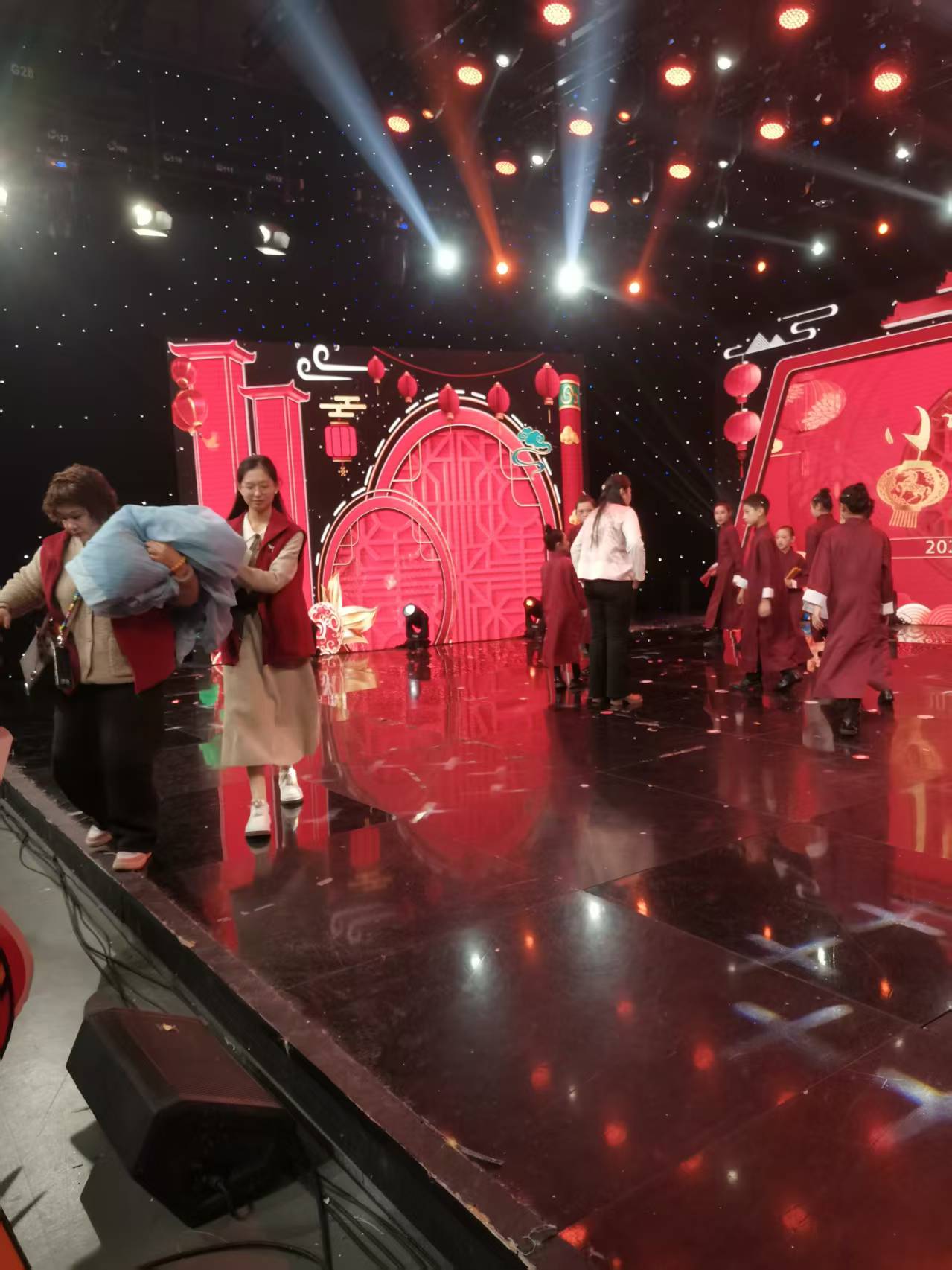 其次是大型文化活动执行。全程参与“2026年青岛市少儿春晚”的节目录制工作,负责后台场务管理。这是艺术管理中“项目策划与执行”环节的实战演练,也是本次实践的高光时刻。随着2026年青岛市少儿春晚录制进入倒计时,我的工作阵地从教室转移到了青岛市广播电视台演播厅。作为场务组志愿者,主要负责候场区秩序维护、道具搬运及演员精彩瞬间等工作。20余个节目、近200名小演员挤满后台,现场一片忙碌。面对嘈杂的环境和紧张的录制节奏,我迅速调整状态,主动协助导演组优化候场流程。通过制作简易的《候场进度表》,将节目分为“待命区”“备场区”“上台区”进行动态管理,确保节目衔接无缝高效。在道具管理环节,与道具组伙伴反复走位,给每一件道具编号定岗,在30秒内完成舞台转换,获得了导演组的肯定。