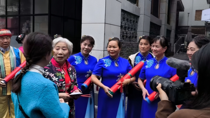 (图为实践团成员采访桂林渔鼓“天天唱”艺术团的老师们。韩静茹摄)