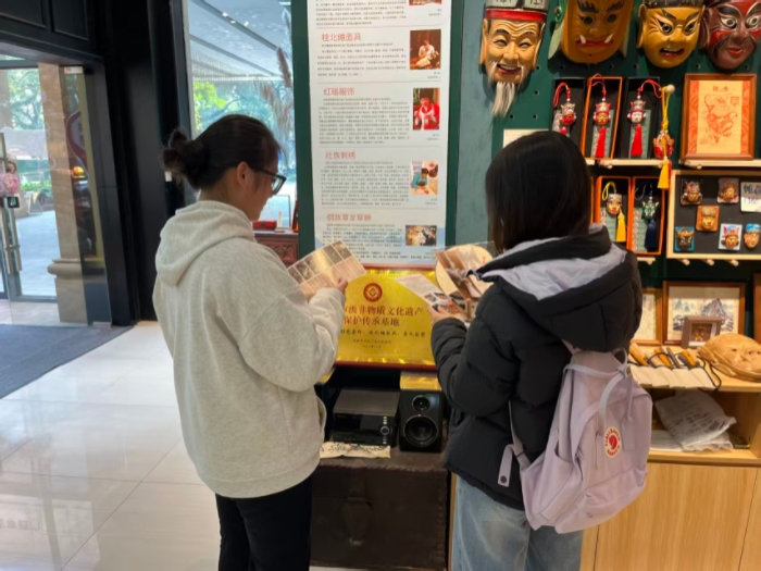 在桂林群众艺术馆桂林渔鼓传承展示中心,团队成员借助实物陈列、图文介绍、影像资料等多种形式,系统了解了桂林渔鼓的历史文化脉络。此外,实践团还走进桂林市非物质文化遗产保护传承中心,与工作人员深入交流铸牢中华民族共同体意识视域下,以桂林渔鼓为纽带,推动非遗赋能多民族地区文化共兴、发展共进的实践路径与创新举措。
