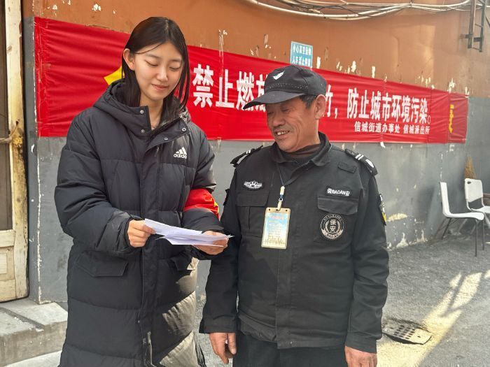 图为实践队员与社区安保人员交流,将政策宣讲与普通话推广相结合。
