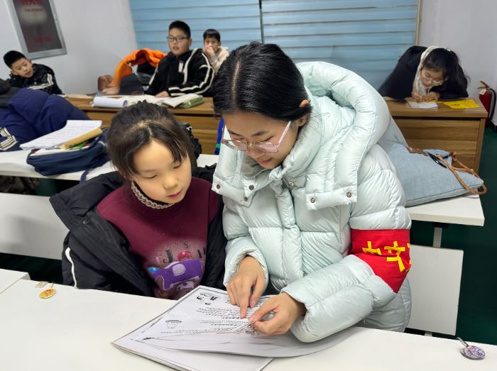 图为实践队员在寒假课堂中辅导孩子规范读写。