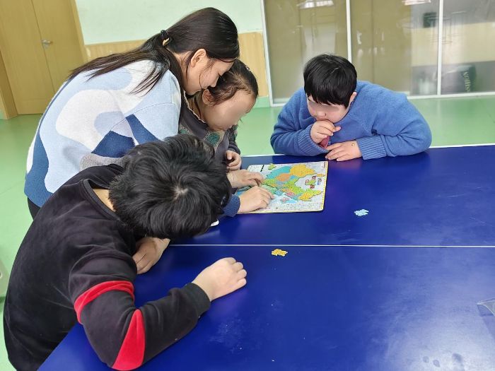 在如康家园,服务团成员结合残障儿童的身心特点与能力差异,设计并开展了两项特色实践活动。在“巧拼山河,情暖童心”拼图活动中,志愿者以中国地图拼图为互动载体,用“大公鸡”“小船”等生动比喻讲解国家版图轮廓与省份形态,针对孩子们的不同能力开展个性化指导,对认知能力有待提升的孩子,在陪伴拼图的同时科普省份名称、地域特色等知识,将国家意识与地理认知融入趣味互动,让孩子们在动手实践中锻炼手眼协调与空间思维能力,也在欢声笑语中增强表达信心与国家认同。