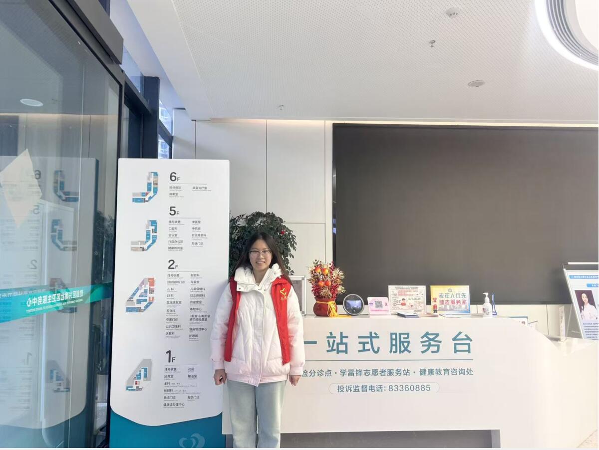 三、服务台协助,优化居民就医体验 在熟悉医院整体环境后,实践人员来到医院的一站式服务台附近协助工作人员开展志愿服务。作为医院的重要服务窗口,一站式服务台承担着咨询解答、流程引导以及信息服务等多项工作,每天都会接待大量前来咨询的居民。