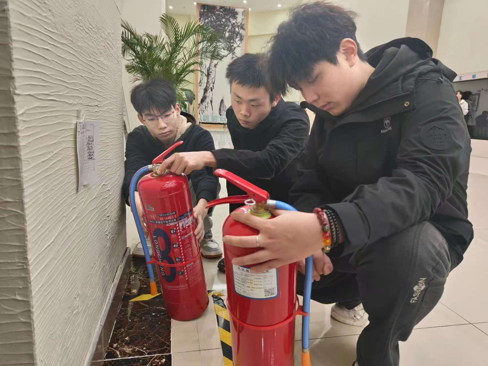 图为实践团成员检查灭火器