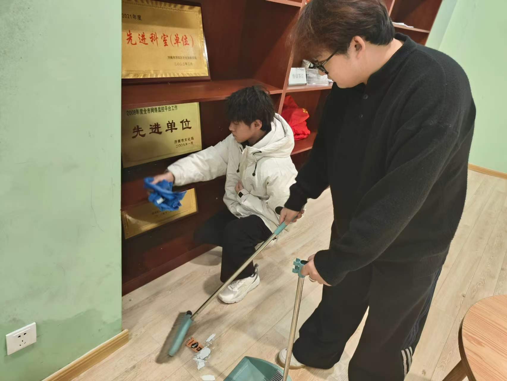 另一组志愿者则拿起抹布、扫帚等工具,对展厅地面、展柜边缘及荣誉陈列区进行全方位清洁,仔细擦拭牌匾上的浮尘、清理角落杂物,让博物馆的每一处空间都保持整洁有序。