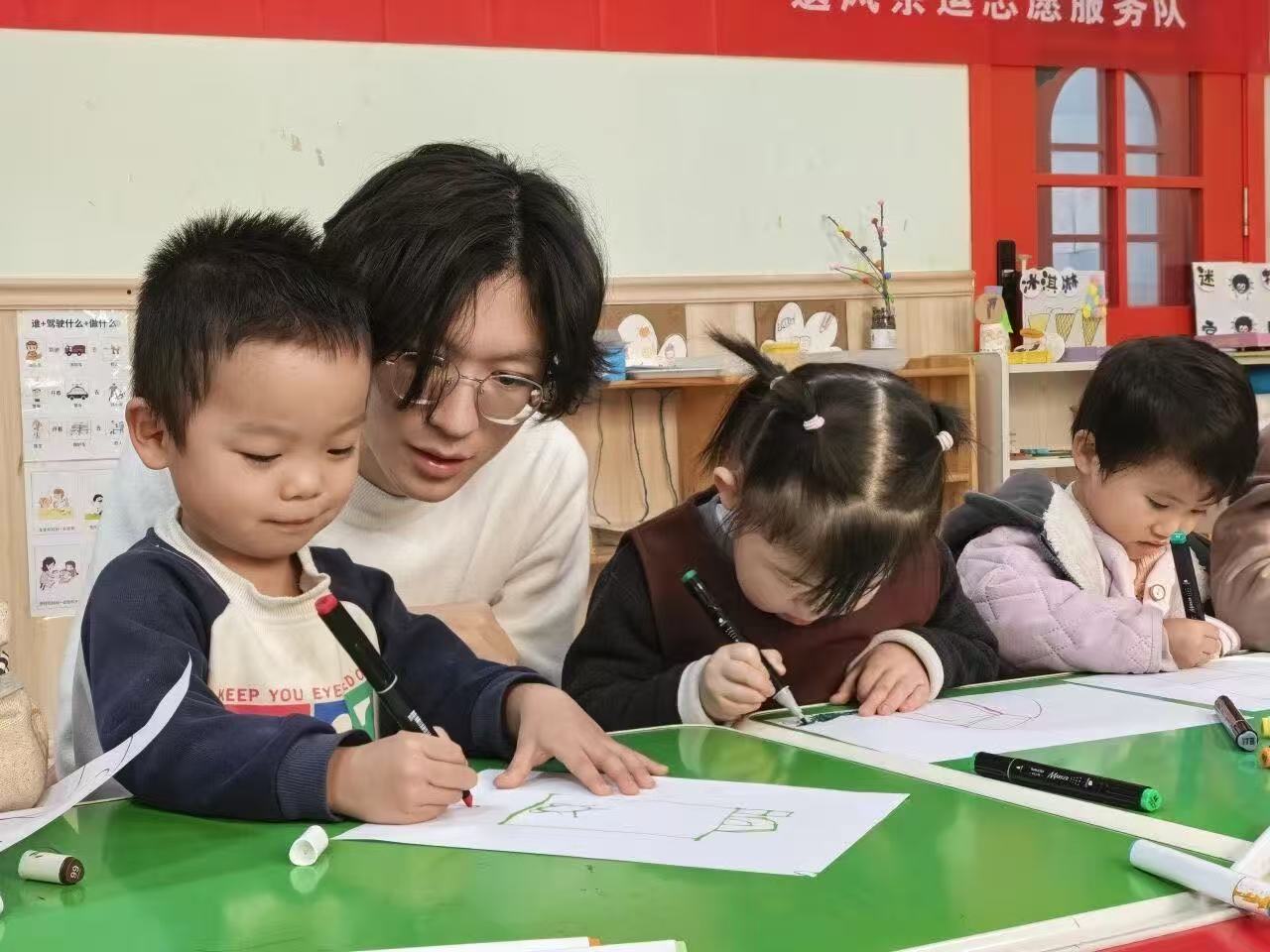 志愿者通过PPT讲解,结合机器人、智能设备等鲜活案例,用生动有趣的语言为小朋友们科普现代科技知识。互动提问中,小朋友们的好奇心被充分点燃,纷纷举手分享自己的奇思妙想。科技绘画创作环节,志愿者分组指导,鼓励小朋友们将脑海中的未来世界画在纸上,小朋友们拿起彩笔,画出了会飞的汽车、能自动浇水的植物、陪伴玩耍的智能伙伴等充满童趣的作品。在作品分享展示环节,小朋友们自信地走上台,讲述自己的科技创意,志愿者则用温暖的肯定与鼓励,使小朋友们的科创热情持续升温。