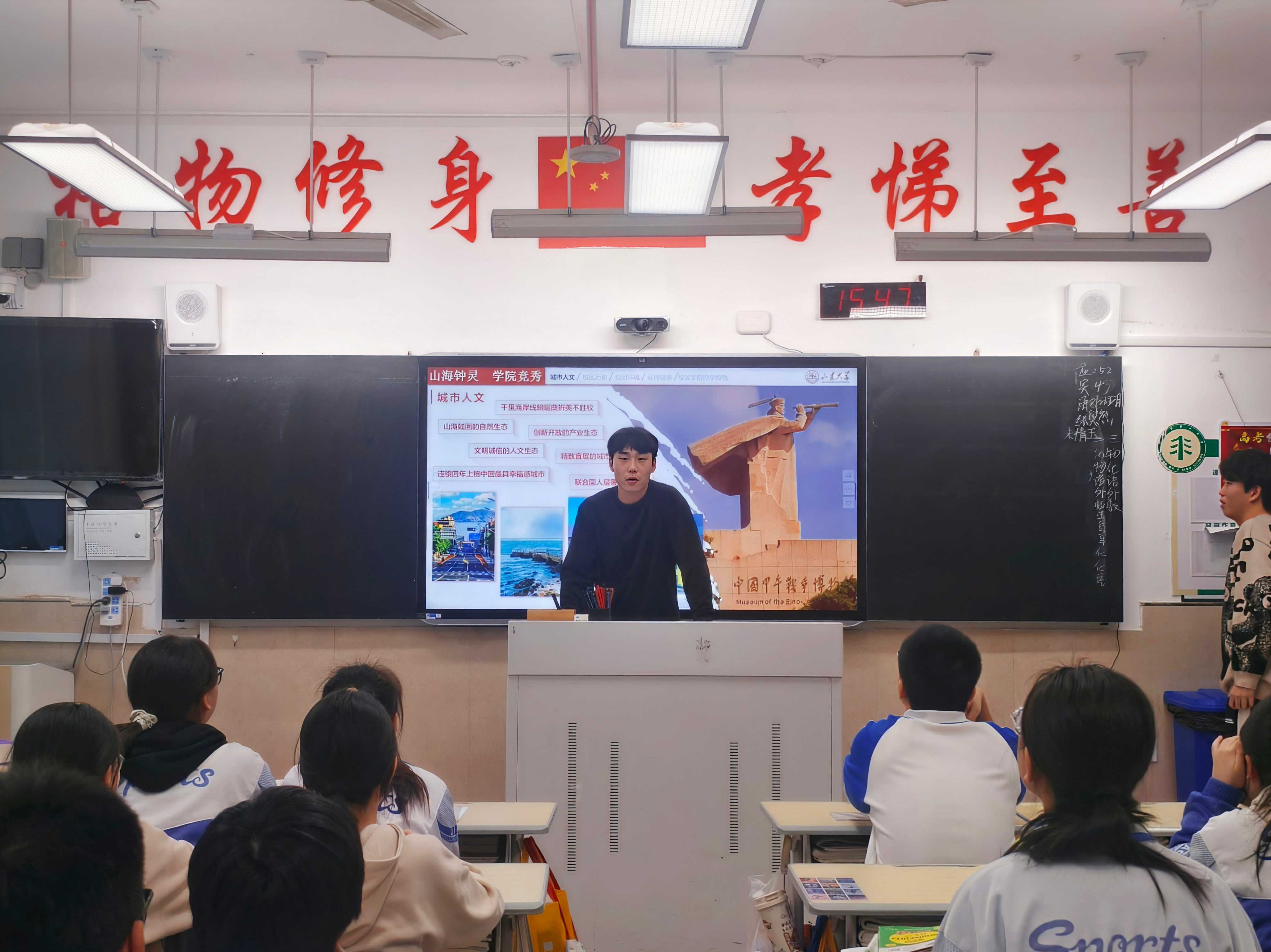 1月23日,宣讲团成员走进高三班级,与学弟学妹们面对面交流。宣讲环节中,成员们借助精心制作的PPT,生动介绍了山东大学“一校三地八校区”的办学格局,详细讲解了济南、威海、青岛三地校区的特色优势,重点聚焦海洋学院的专业设置、科研平台和人才培养成果,结合自身学习经历,展示了山大优美的校园环境、浓厚的学术氛围与丰富的课余生活。互动环节气氛热烈,宣讲团成员为现场学生发放宣传资料与文创礼品,耐心解答大家关于专业选择、高考备考、大学生活适应等方面的疑问,真诚分享自身的备考技巧、升学经历和励志故事,鼓励学弟学妹们坚定信念、脚踏实地、全力以赴冲刺高考。现场多名学生主动填写山海赴约卡,清晰表达对山东大学的报考意向,还有不少学生主动留下联系方式,希望后续进一步了解山大相关情况,言语间满是对理想学府的向往。