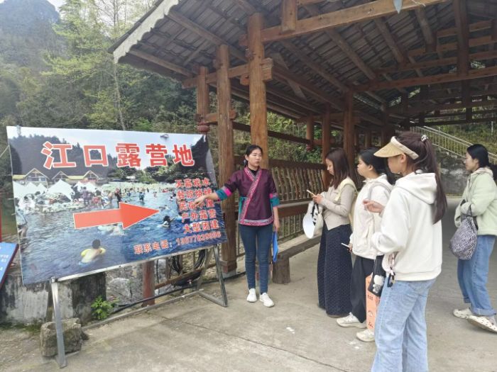 实地走访之后,团队与江口村CEO及村党支部书记进行了深度访谈。围绕“党支部+企业”合作机制的运行模式、休闲宿营基地的建设历程,以及民族文化资源向旅游产品的转化过程,团队成员与村干部展开了深入交流。团队协助梳理了江口村近年来的发展脉络:2021年以来争取民生项目资金1200余万元,将政策资源转化为发展动能;依托沿河生态资源打造休闲宿营基地,创造就业岗位20个;将侗族文化与红色旅游、廉政教育相融合,建成江口风雨桥、红色驿站等标志性景点。2023年,该村累计接待游客5万余人次,直接拉动消费超70万元,并获评自治区四星级乡村旅游区。