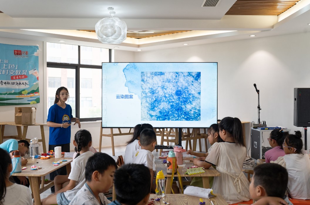 捆缝夹扎的扎染方法,给同学们展示了云染,几何菱形、园心纹、六角星、长条纹等图案,接着欣赏扎染作品,观看了扎染视频,随后张旭颖带他们洗布、扎图案、放到水里沁染,最后捞出成品,还播放了扎染手工视频。