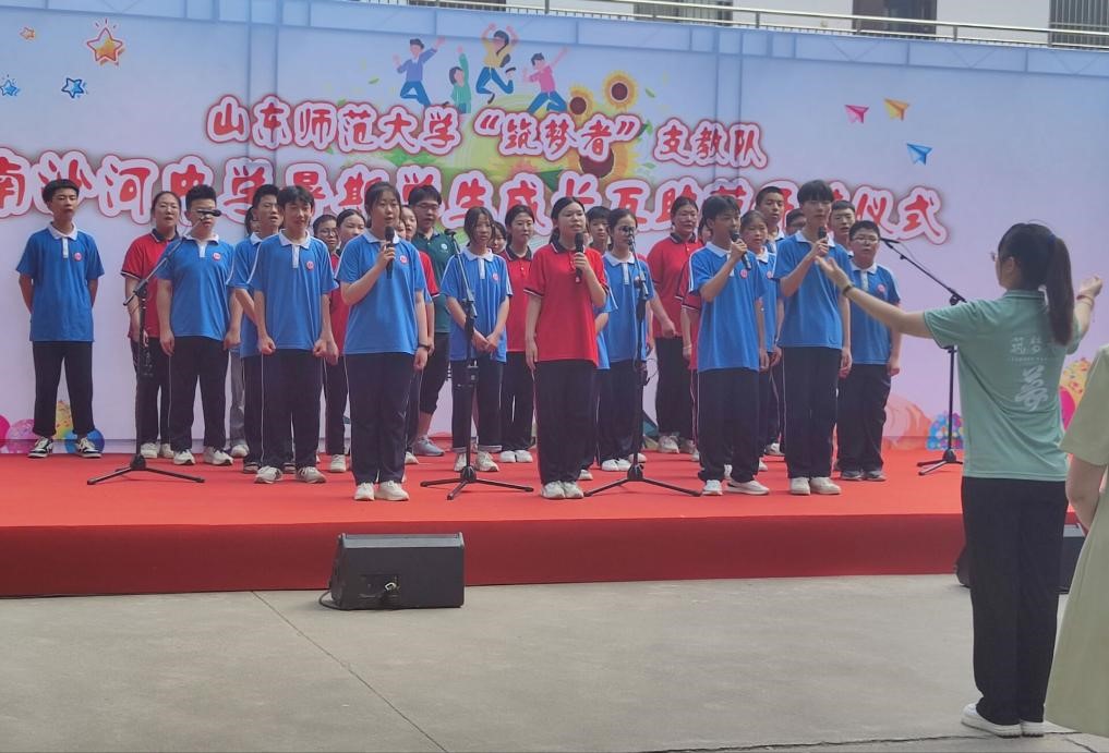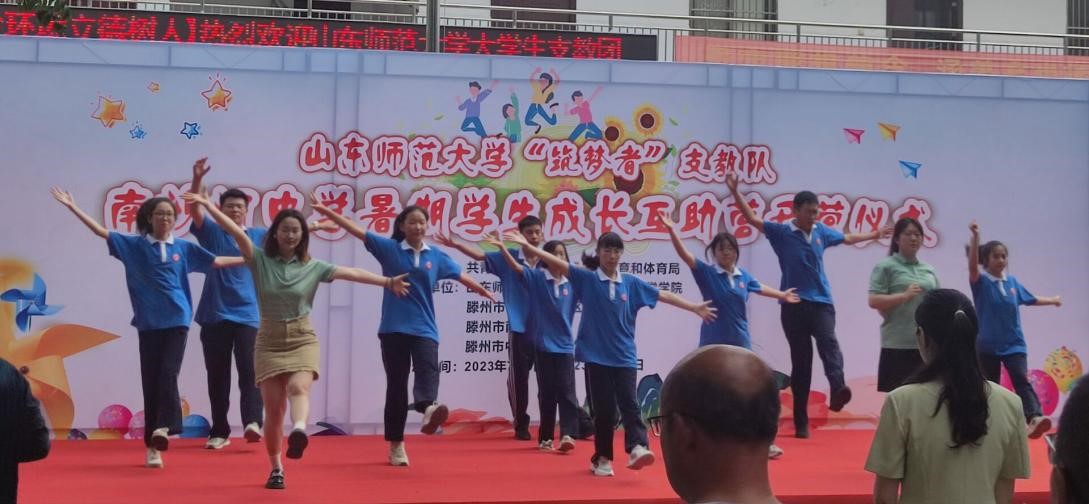 7月8日上午,山东师范大学化学化工与材料科学学院“筑梦者”支教团联合滕州市南沙河中学于行政楼前成功举办了“以身为教铸强国,青春丹心系乡间”成长互助营开营仪式。南沙河镇副镇长满苏宁、团市委办公室主任王海洋、市教体局思政科副科长张霞、镇学区主任李广山、南沙河中学校长王桂桐以及南沙河中学领导干部、教师代表以及山师大筑梦者支教团成员和45名南沙河中学营员出席本次开营仪式。