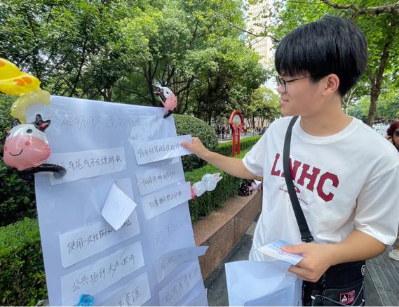 此外,实践团成员还设立了生态环保互动展板,团队成员向市民科普生态环保知识的同时,鼓励市民积极参与互动,在展板上写下自己的环保宣言。现场气氛热烈,市民们参与热情高涨。