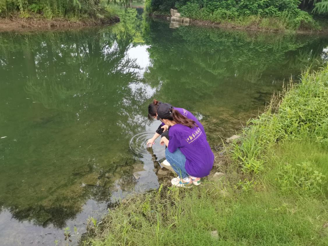 实践团成员利用水样瓶及细绳,坚持不破坏原有水质生态的原则,按照计划前往各采样点进行取水采样,分瓶灌装,并给水样瓶做好标签。在取样过程中,实践成员相互配合,确保全部水质采样任务按时完成,为后续水样分析测试等工作打下了良好基础。