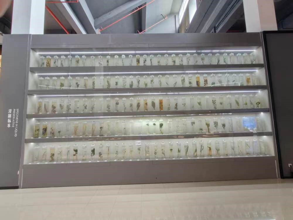 继续上一层,走进中药标本陈列馆,通过位于成员们左手边的两台液晶显示器,可以观看海洋药用资源多媒体展示,也可以参与答题,三楼共有十三个展区,陈列着各式各样的动植物和矿石中药标本,第二展区的四个展柜则分别陈列着一些道地药材的规格等级和真伪对照,第三展区是中药命名方法标本展示区,第五展区陈列着全国中药材道地产区分布图和标本,其余展区是中成药展区等等。走出标本馆,步入与之相邻的校史陈列馆这里有详尽的文字和照片,展示上海中医药大学1956年建校以来的发展历程。