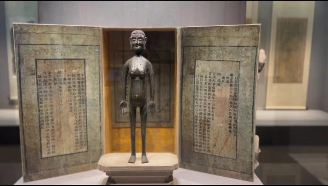 随着探索的深入,成员们来到针灸馆,可以看到二层中间位置展出的上海中医药博物馆的镇馆之宝----1744年铸造的老妇人形象的针灸铜人。这具铜人高46厘米,宽22.8厘米,厚16厘米,为老妇人形象,体态丰腴自然,面部表情慈祥生动。历史上针灸铜人的形象一般为男子,老妇人形象极为少见,且体表铸有经络穴位,但未铸经穴名,现国内仅见此一件,十分珍贵。据文字记载,乾隆皇帝为了嘉奖编纂综合医学丛书--《医宗金鉴》的编著人员,定制了一批针灸铜人,如今国内仅存此一件带锦盒的完整器具。这具针灸铜人是传世针灸铜人之中难得一见的老妇人的体态,高约46厘米,面容慈祥,体表刻有580个穴位,锦盒上印有皇帝玉玺,题跋上用汉满文注明了铜人颁发给《医宗金鉴》的誊写官福海。上海中医药博物馆的展宣部馆员陈侣华曾说过这一套医书整体有90卷,里面不仅仅包括针灸学的内容,涉及了内外妇儿疑难杂症方方面面,但他单单取针灸铜人这个形象,作为奖品奖励给这些医官,这足以反映针灸铜人的医学价值所在